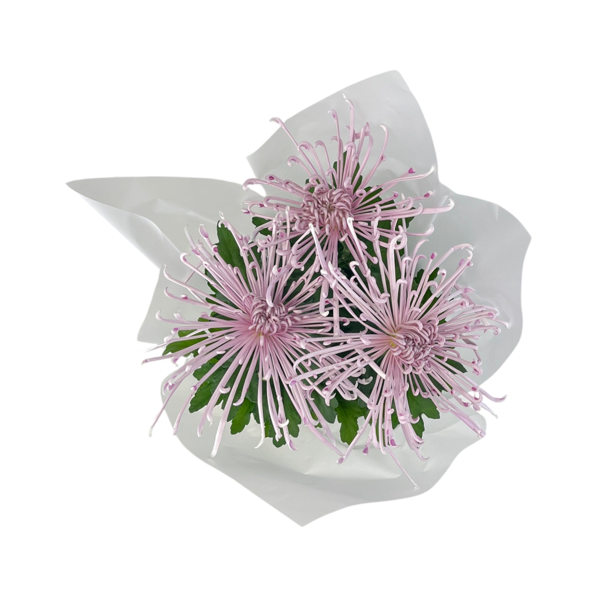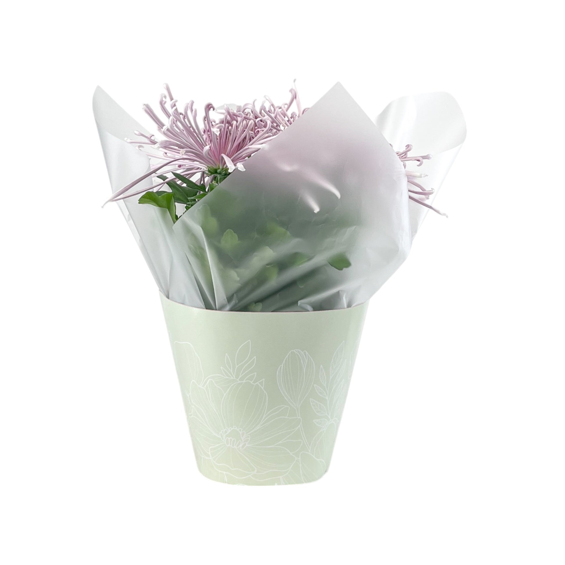 Our green floral gift cone makes for a great entry level price point, pick-up gifting line, featuring pink and white Chrysanthemum disbud varieties including pink and white blooms and fireworks.