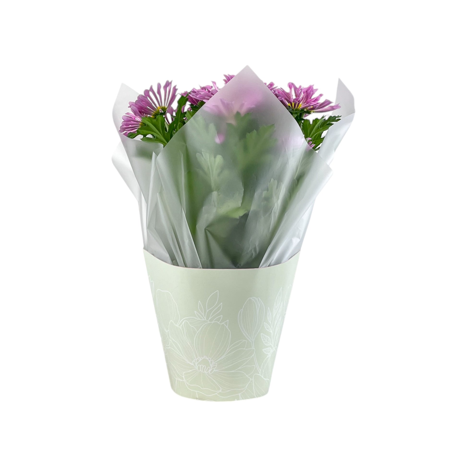 Our green floral gift cone makes for a great entry level price point, pick-up gifting line, featuring pink and white pinched Chrysanthemum varieties .